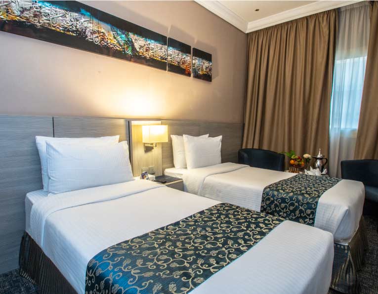 على أحدث الطرازات العصرية يأتي تصميم الغرف والأجنحة في فندق البيت الروضة لنوفر لضيوف الرحمن تجربة استثنائية من الراحة والطمأنينة حيث يضم الفندق ۷۶۸ غرفة وجناح مجهزة بأثاث عصري وحديث وأغطية وإكسسوارات عالية الجودة، ثلاجة صغيرة، تليفزيون مزود بقنوات محلية وعالمية، نظام تكييف، وسائل الأمان والسلامة مثل جهاز كشف الدخان ونظام إنذار للحرائق وخطة الهروب في حالة الطوارئ، دورات المياه مجهزة بجميع الإكسسوارات مثل مجفف الشعر، مرآة مكبرة للحلاقة وكافة الأدوات الشخصية. كما لدينا غرف لذوي الاحتياجات الخاصة تم تجهيزها لتلائم احتياجاتهم سواء داخل الغرفة أو داخل دورات المياه وتوفير العربات الخاصة بهم وغير ذلك من الخدمات لضمان قضاء إقامة ممتعة تشعرك وكأنك في بيتك.